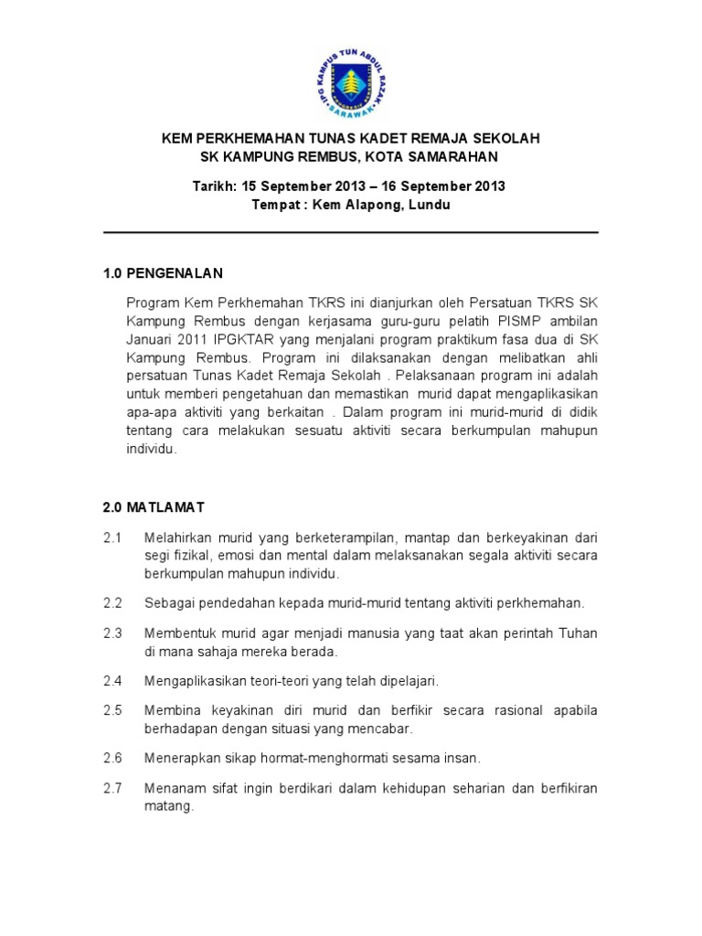 Kem Perkhemahan Tunas Kadet Remaja Sekolah Sk Kampung Rembus Pdf